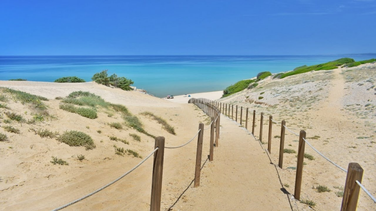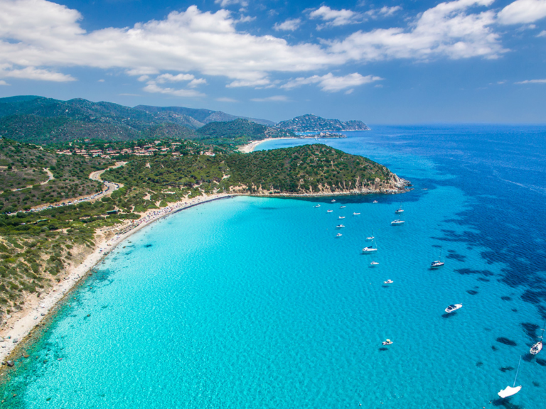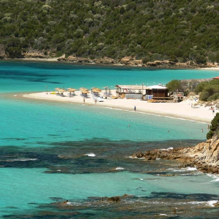 Su Giudeu is one of Chia's signature beaches, with a broad white shoreline, shallow water and an islet reachable when the tide is low. Behind the beach, dunes and lagoon environments add ecological value and beautiful sunset views.