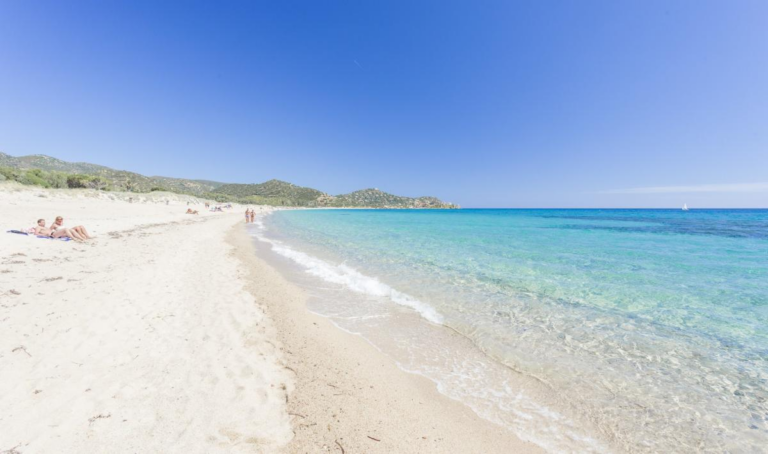 Porto Giunco is one of Villasimius' best-known beaches, with fine pale sand and clear turquoise water near the Capo Carbonara marine area. Its shallow, transparent sea and scenic lagoon backdrop make it ideal for long swims and snorkeling.