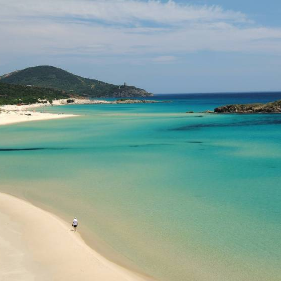 Tuerredda is a sheltered cove between Capo Malfatano and Capo Spartivento, often compared to Caribbean beaches for its color. A small islet sits just offshore and the calm, sandy seabed makes the bay excellent for swimming and snorkeling.